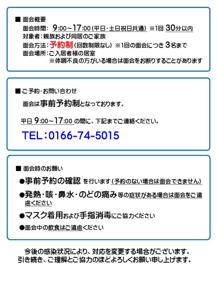 最新記事 2026.04.245月献立表を掲載いたします。 2026.04.23大型連休に伴う休館のお知らせ 2026.03.234月の献立表を掲載いたします 【お知らせ】面会制限の一部緩和について(5月1日より) 2026.04.23 平素より、住宅型有料老人ホーム花時計の運営にご理解とご協力を賜り、誠にありがとうございます。 当施設では感染症予防のため面会制限を実施しておりましたが、令和8年5月1日より、条件付きで面会制限を一部緩和いたします。 前の記事へ 次の記事へ お知らせ一覧へ